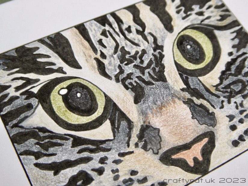 For Christmas 2021 I adapted a digi stamp and turned it into a portrait of her kitty Tommy. For this birthday, I decided to get more arty and create a kitty close-up. I snagged a photo off Facebook and used it as a reference; I was stretching the level of detail in the photo, so it could definitely be more accurate, but I like the way it turned out.