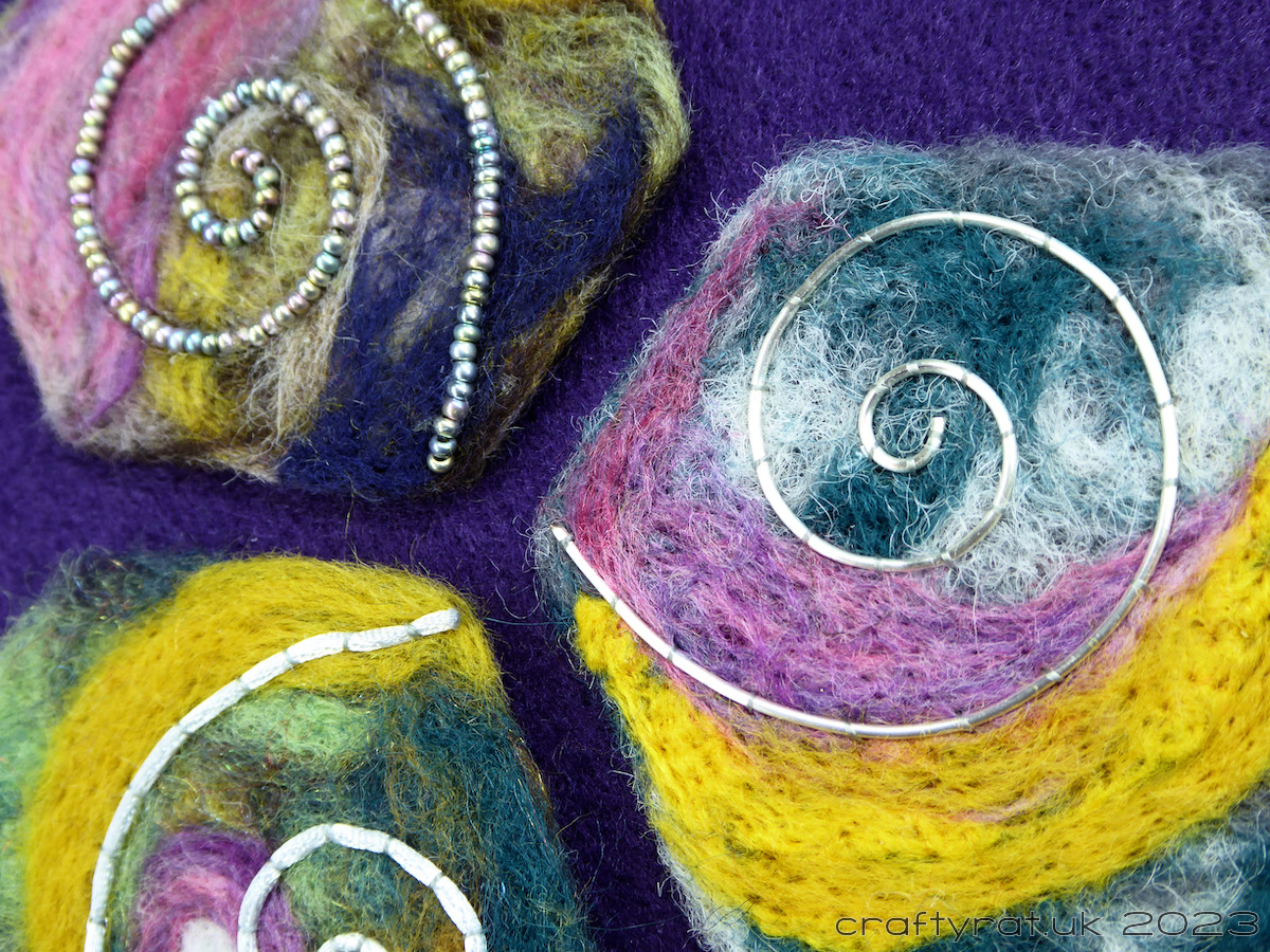Rather than simply mount the three hexagons together, I wanted to add a bit more decoration. There were some curves in the felting so I exaggerated that and went with a spiral motif. I created the first one from a piece of jewellery wire and used that as the pattern for the others: one from some silky jewellery cord that I couched in position and one from a string of small seed beads. I did try stitching the beads in place but that really didn’t work so I glued them instead.