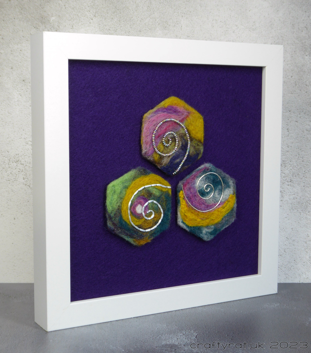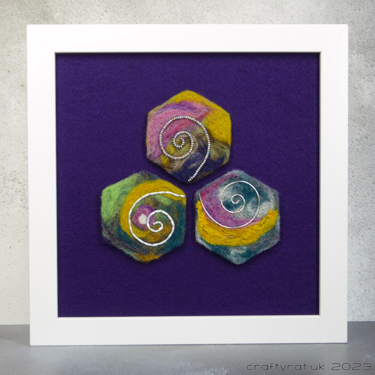 And it was ideal. Small enough that I could play and neat enough that the end result could be used as part of another project. Also small enough that I could easily use up some of the small scrappy bits in the bag of waste felting fibres I’d picked up on Amazon. I ended up making four hexagons and choosing the three that worked best together for this piece.
