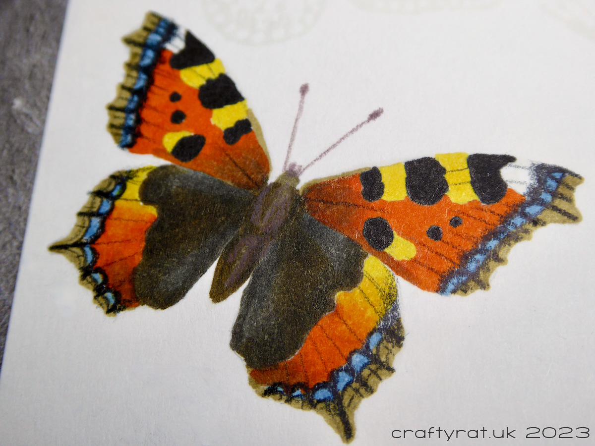 I used Ink on 3’s Fadeout ink, which is designed for no-line colouring. Because it mostly disappears under Copic (with the exception of some very pale colours) it allowed me to alter the shape of the stamped images with very light pencil marks to more accurately match the outline of real butterflies.