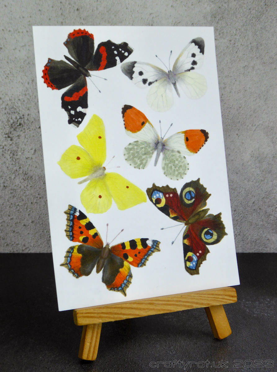 I wanted to colour some more realistic butterflies; specifically some of the ones I remember from my childhood. I wanted the shapes and the colours to match real life and not end up looking like a cartoon version. I picked a simple butterfly stamp and started by stamping half a dozen butterflies.