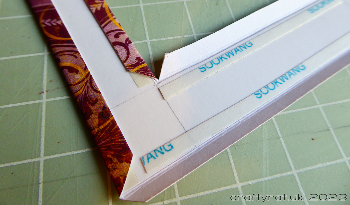 I created a wide frame out of plain card in a matching colour, but it looked a bit uninspiring so I delved into my collection of patterned papers. After much flicking through paper pads, I finally came across this one which was such a good colour match for the background fabric. I wrapped the paper around the card frame; I could have just cut it to the same size as the card frame and layered it on top, but this way all the edges were neatly covered and it looked a lot nicer.