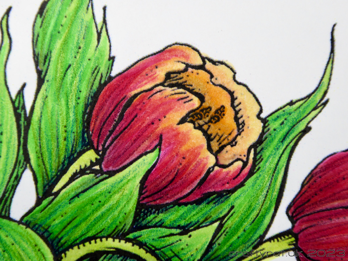 I coloured this image once before but there are so many ways to colour tulips that doing it again doesn’t feel like repeating myself. I did spend quite a bit of time browsing through Google images to find one that inspired me before settling on red ones with orangey-yellow petal tips.