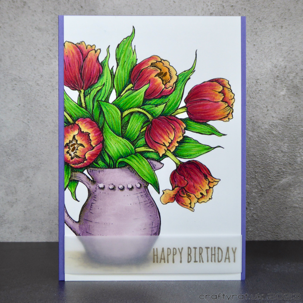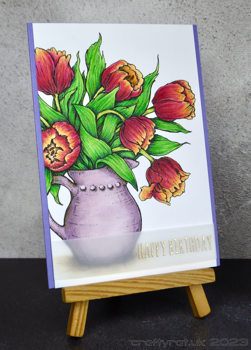 Nothing out of the ordinary technique-wise with this card. Just a reliable Power Poppy digi stamp (tulips in hobnail pitcher) and Copic colouring with a few pencil details, finished off with a heat-embossed sentiment on a strip of vellum.