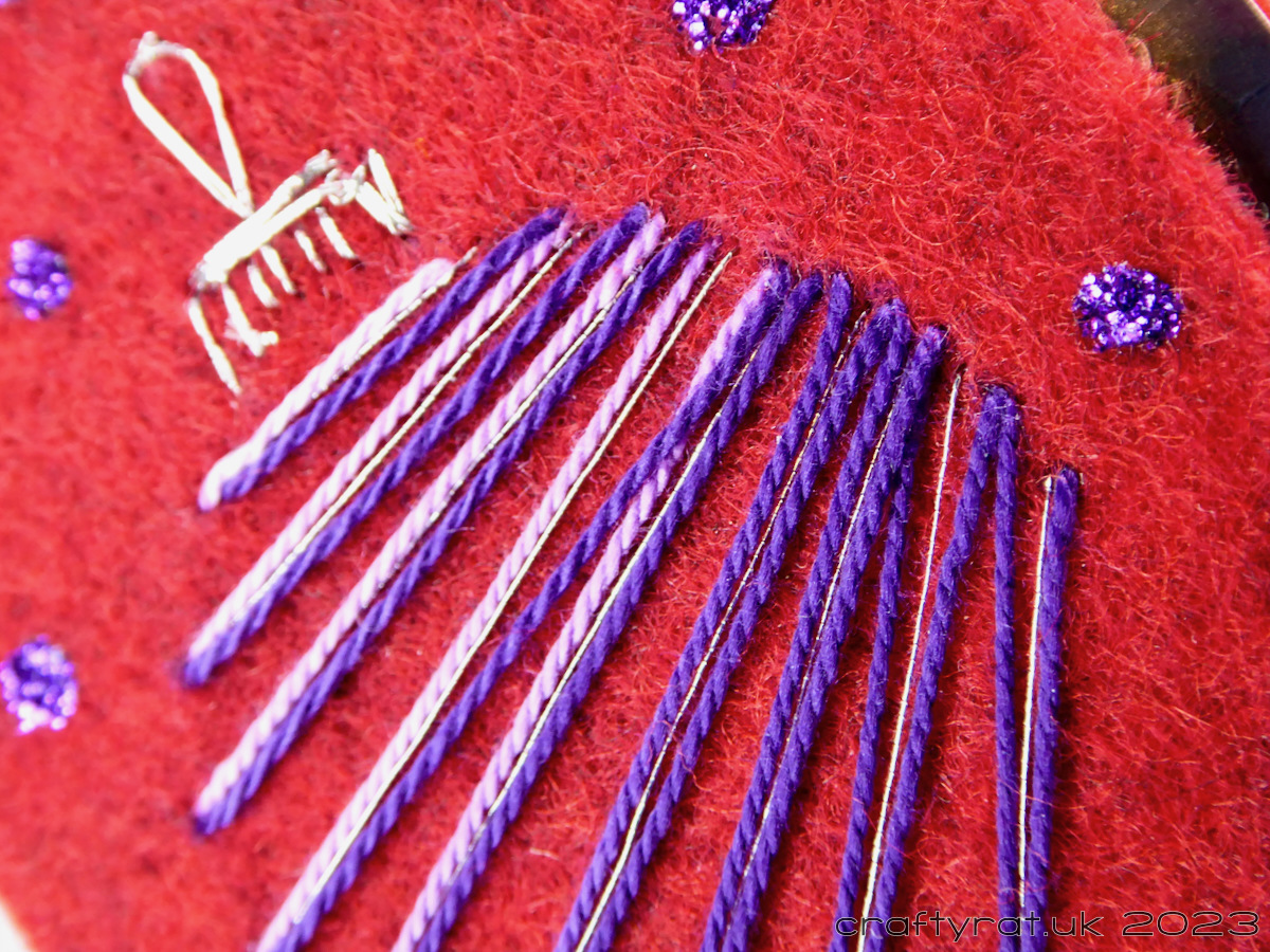 I like the purple one, though it would have looked better on a white background. But, I was using what I had in my stash and I had run out of white felt by this time.