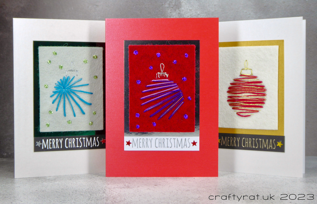 All of the designs are different, but they all follow the same basic recipe. A Christmas motif hand-embroidered on felt (6x8cm) which is then mounted on a slightly larger piece of card (7x9cm). That is then stuck onto a card base with a heat-embossed sentiment strip attached directly below. A few embellishments — stars at each end of the sentiment — and, in the case of the baubles, some dots of Imagination Crafts detail sparkle in the background.