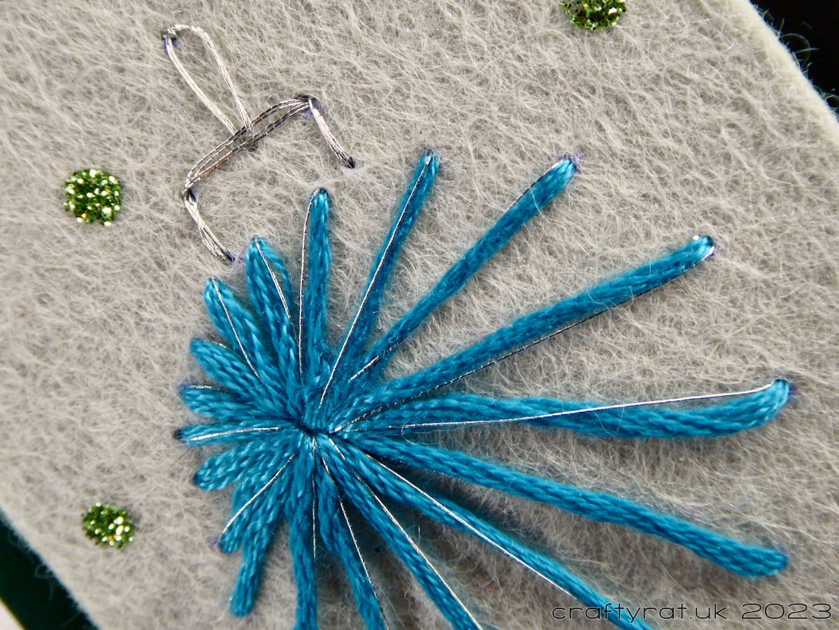 I would do the blue one slightly differently if I was doing it again, but it’s only now, looking at the photos, that I’ve realised what I would do. It needs some additional stitches going from the edge of the bauble towards the centre — probably in a darker blue — to fill the shape out a bit. And the silver stitched bauble top doesn’t stand out well enough on the pale grey felt, especially from a distance. But overall, I am happy with how they turned out.