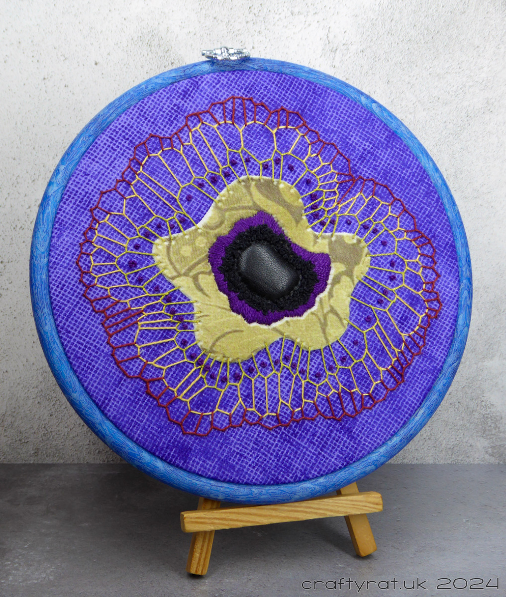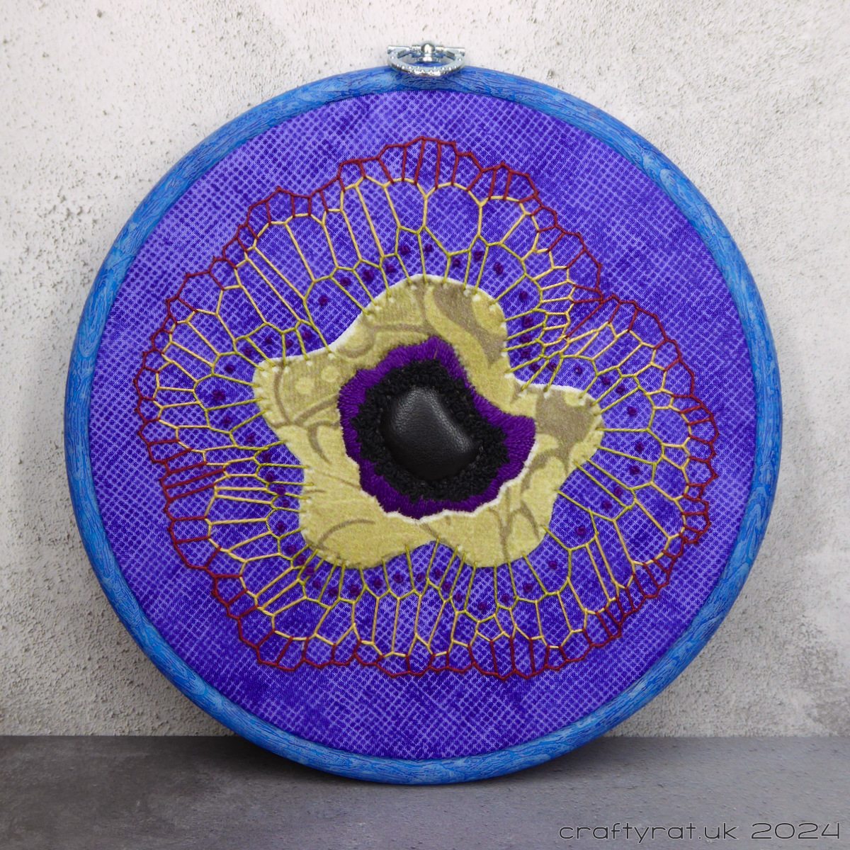 This also shows a simple way of mounting a piece in a hoop: position, make it taut, trim, and then fix with a running stitching using strong button thread or similar. On some pieces, I have then gone on to stitch a circle of felt over the back to create a really neat finish.