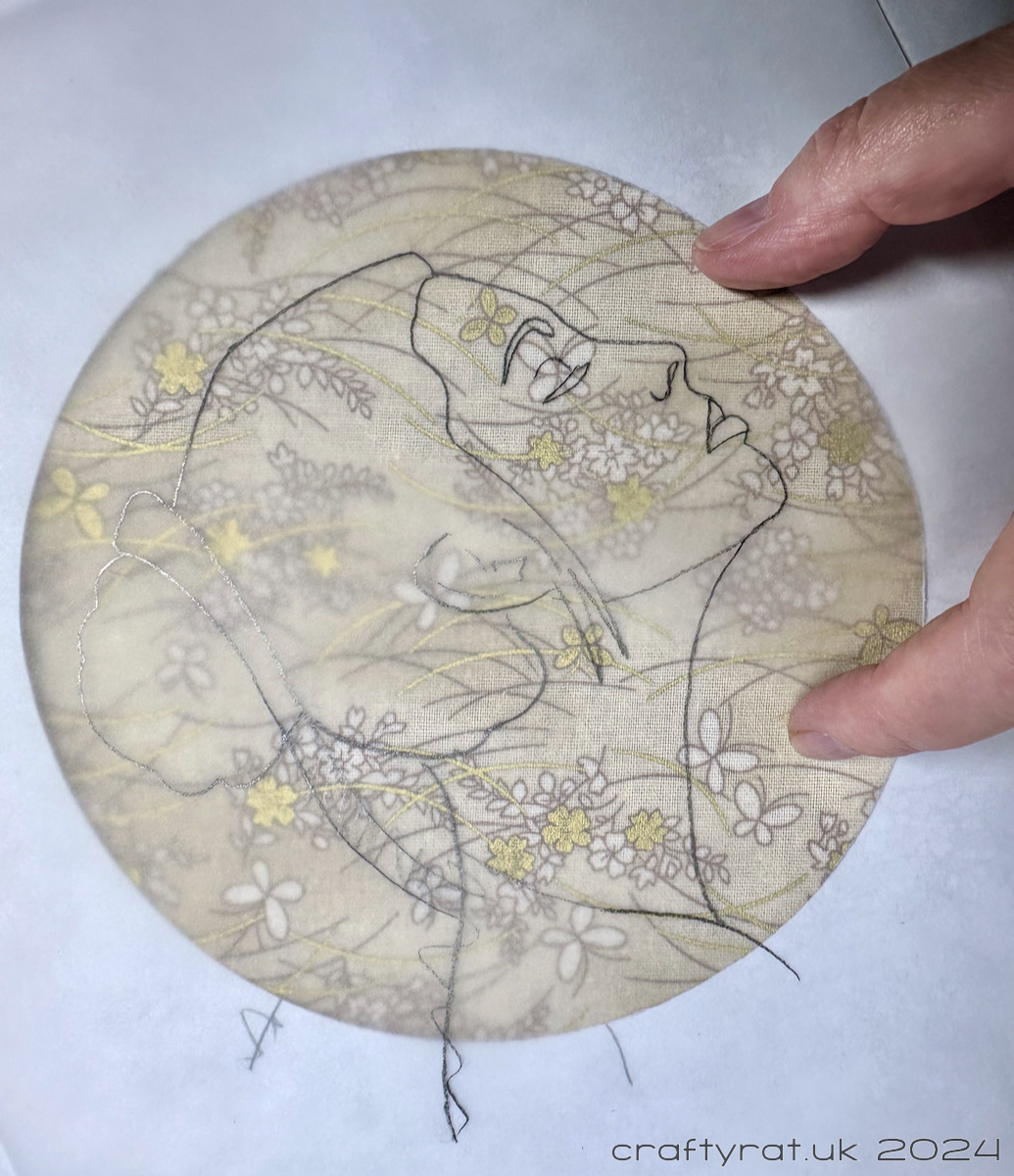 Finding the right fabric design took almost as long as finding the photo; I must have tested half of my stash before settling on this one. In the end it worked really well because the gold acted as a resist for the green fabric paint which added to the interest in the background.