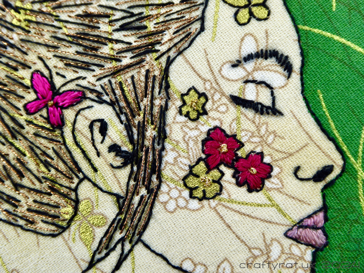 Once the design was transferred and the background painted it was time to start stitching. So much stitching. Super tiny backstitch around the outline to get as much detail as possible. Chain stitch to fill the hair band. Kind of satin stitch for the flowers, butterfly and lips. And lots of straight stitch for the hair. I started out just doing the black thread over the hair, but after finishing it and letting it sit for a day or two, I decided that it really did need something extra and I added copper metallic stitching in between the black.