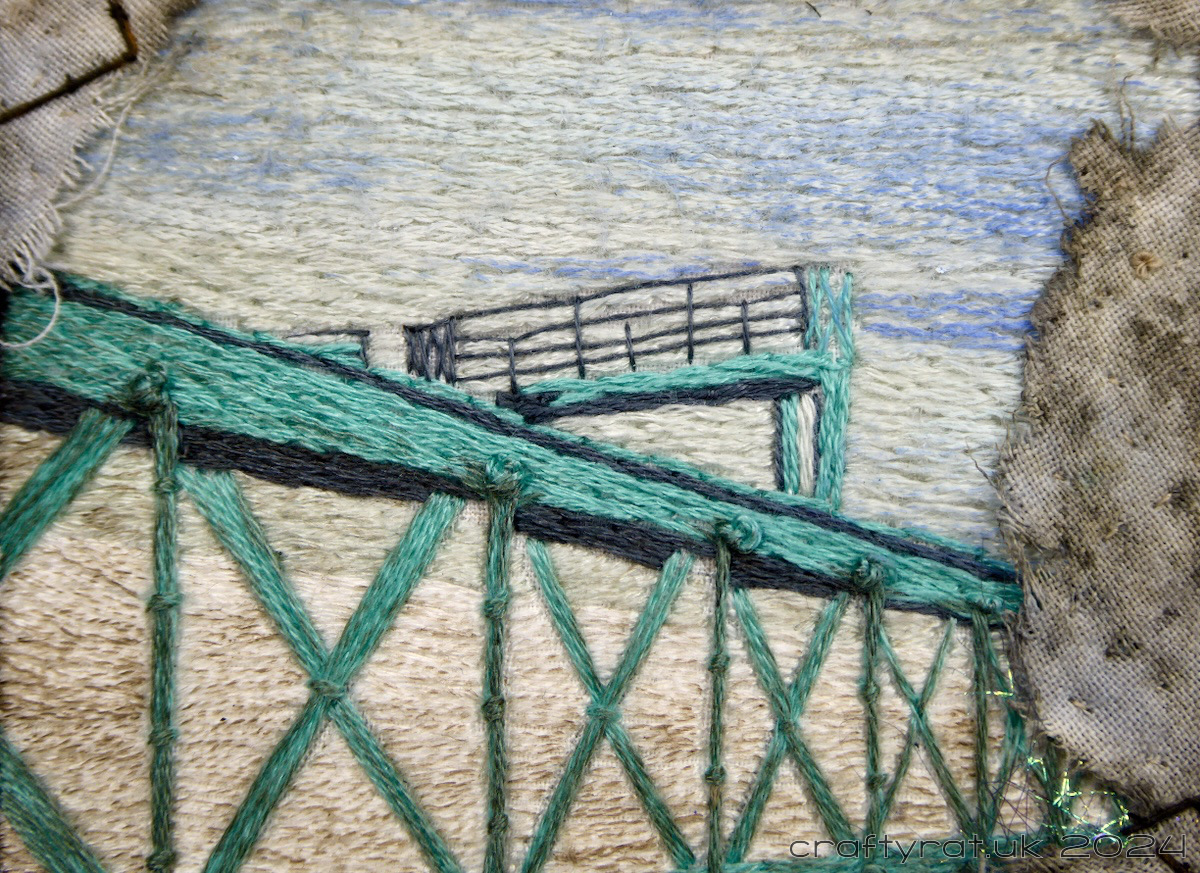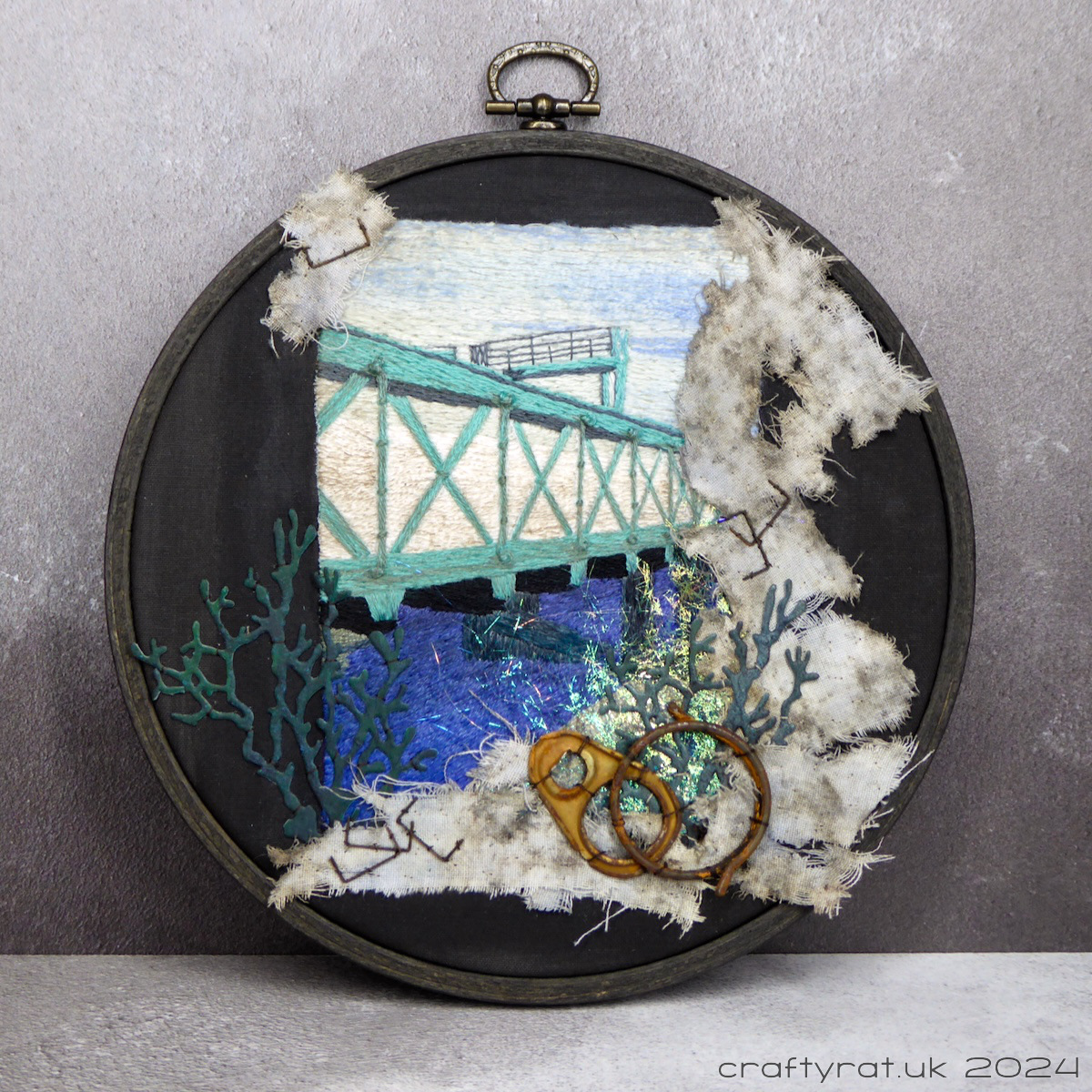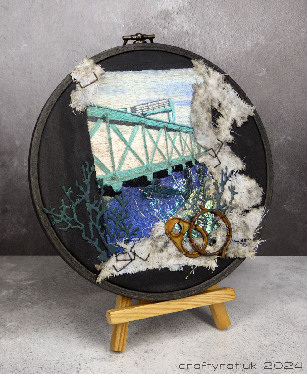 The second half was the really fun bit: adding extra colour to the design and then adding other elements around it. Once I’d got past the concern about “messing up” my neat embroidery, I got to deliberately grunge it up with some walnut ink to add a bit of “dirt” and various acrylic inks to add colour into the sky and water. I also painted the background with black fabric paint.