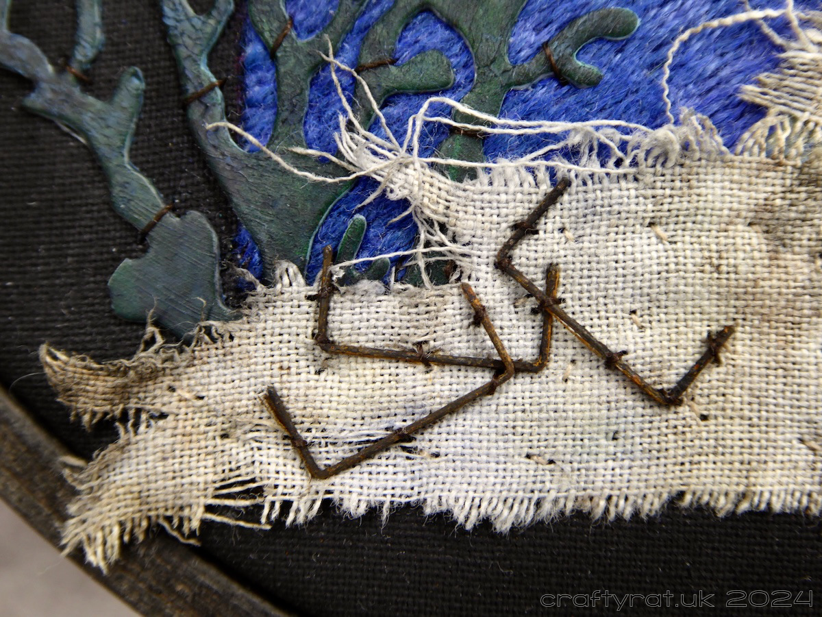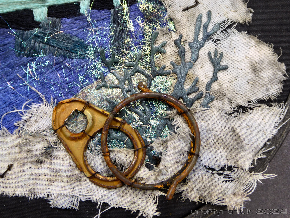 The final stage was to find various “stuff” to frame the image. I ended up using some cotton that I had distressed by burying it in the garden for a few weeks, along with a couple of seaweed die-cuts, a bit of Angelina for sparkle, and some bits of metal that I had left outside to rust.