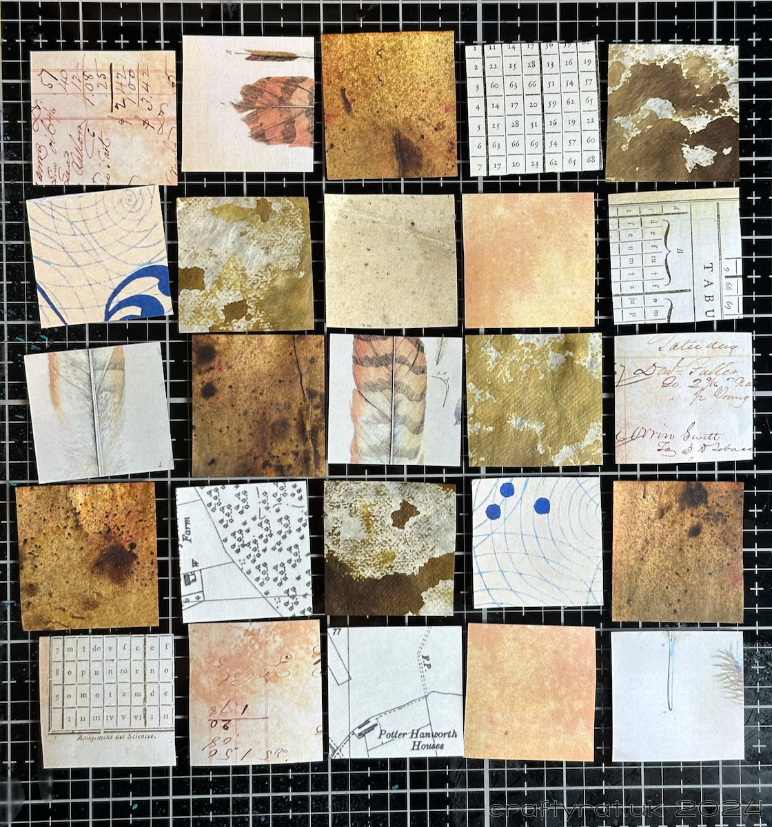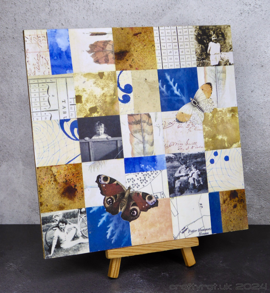 I can be quite lazy (let’s be charitable and call it “efficient”) at times when it comes to choosing supplies for projects, reaching for the things that are nearby rather than trying to remember exactly where I left a certain pen or trinket. So when I set about choosing papers for this vintage-inspired grid collage I started by going through the ones left over from making the Photo Kintsugi collage, including some that didn’t end up being used.