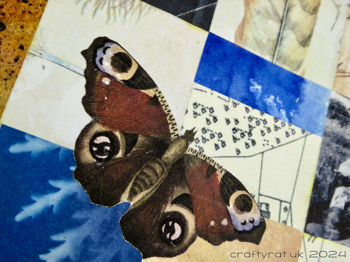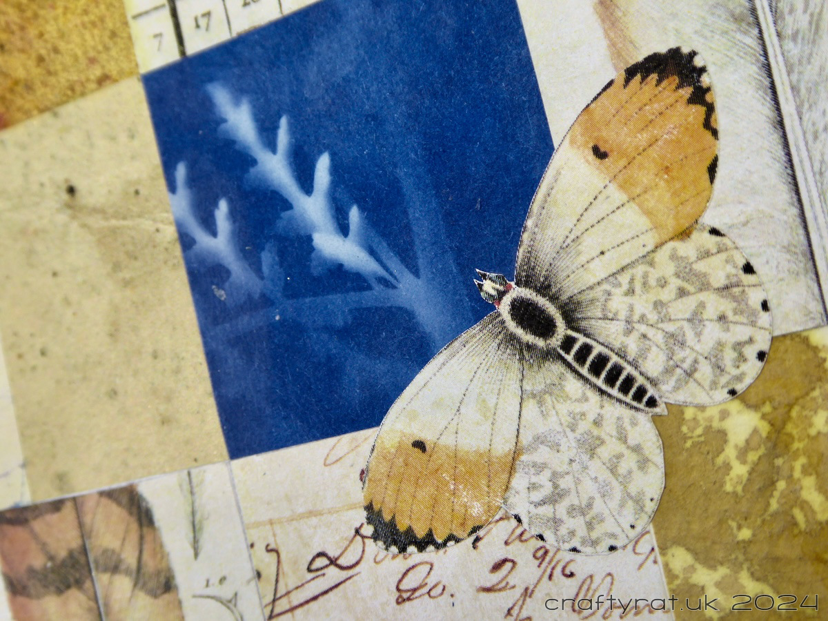 I wanted to add a bit of colour and was inspired by the paper with the blue ripples. Needing more blue, I found some scraps of painted paper and a not particularly successful cyanotype that still had a few interesting bits that I could use.