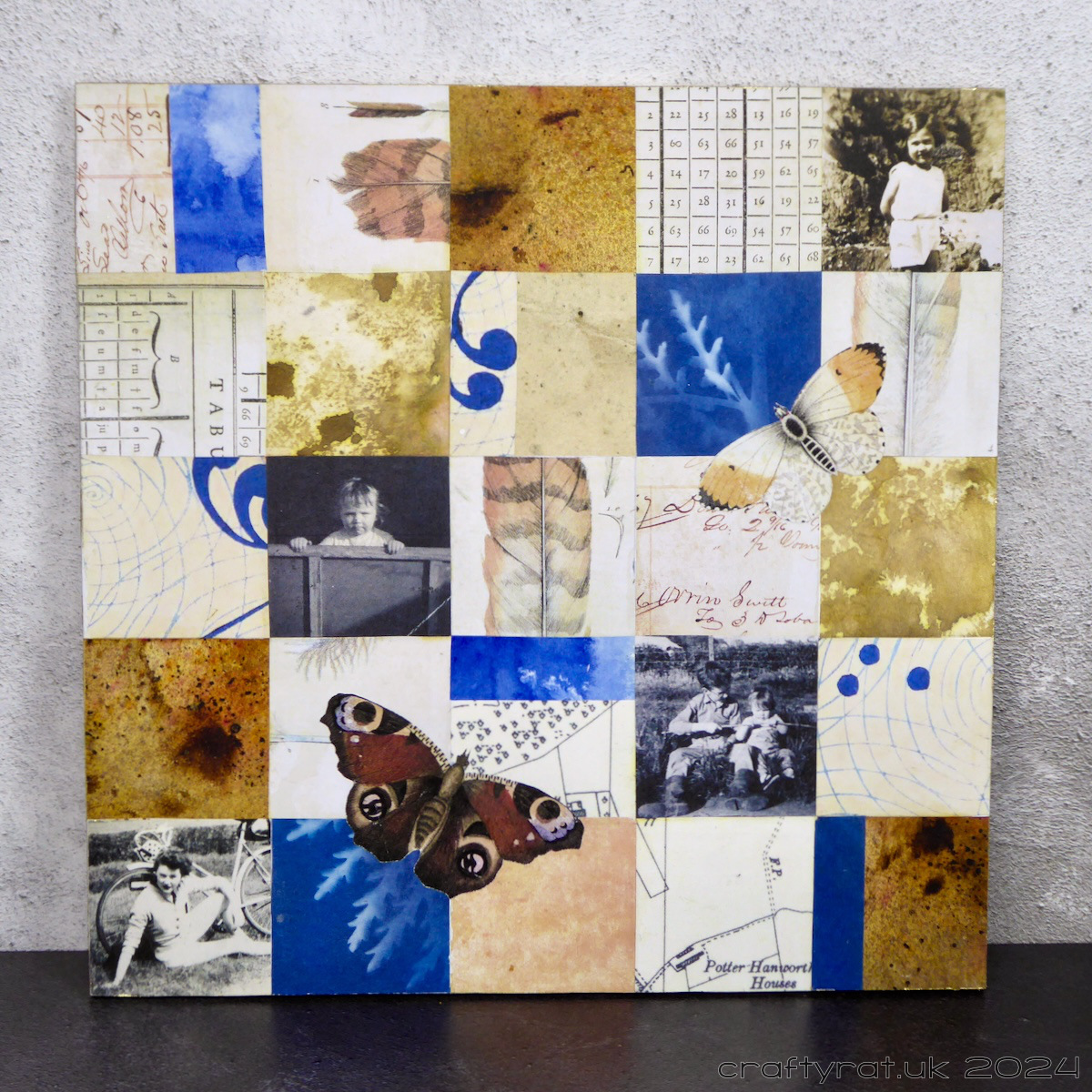 The map, numbers and handwriting gave me a good foundation. To add texture, I chose papers from my stash that I had coloured with sprays and pigment powders (Brusho). I also had some small prints of old family photos that were just the right size for this grid.