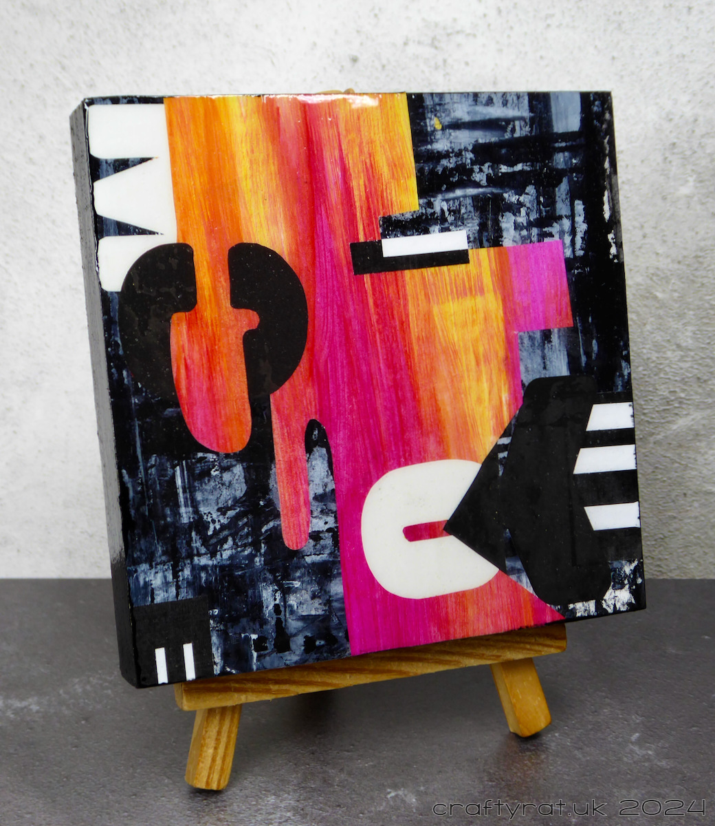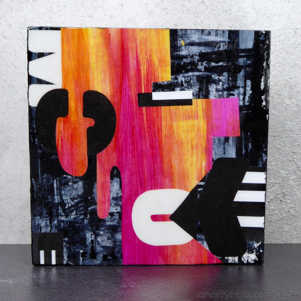 I assembled it all, adding some letter shapes to break up the outlines, and finished it off with a coat of gloss medium.