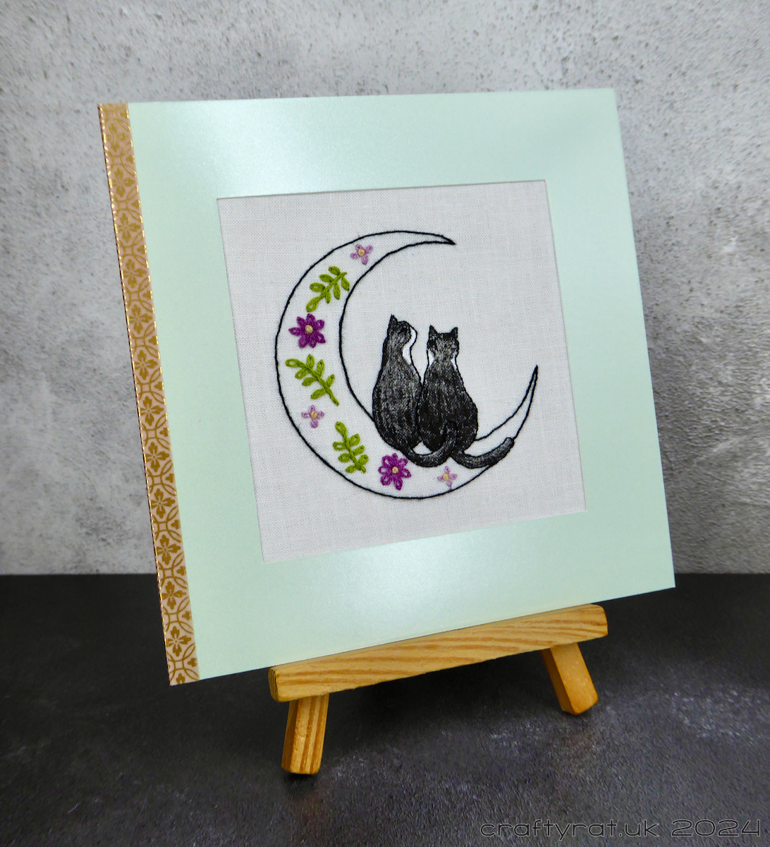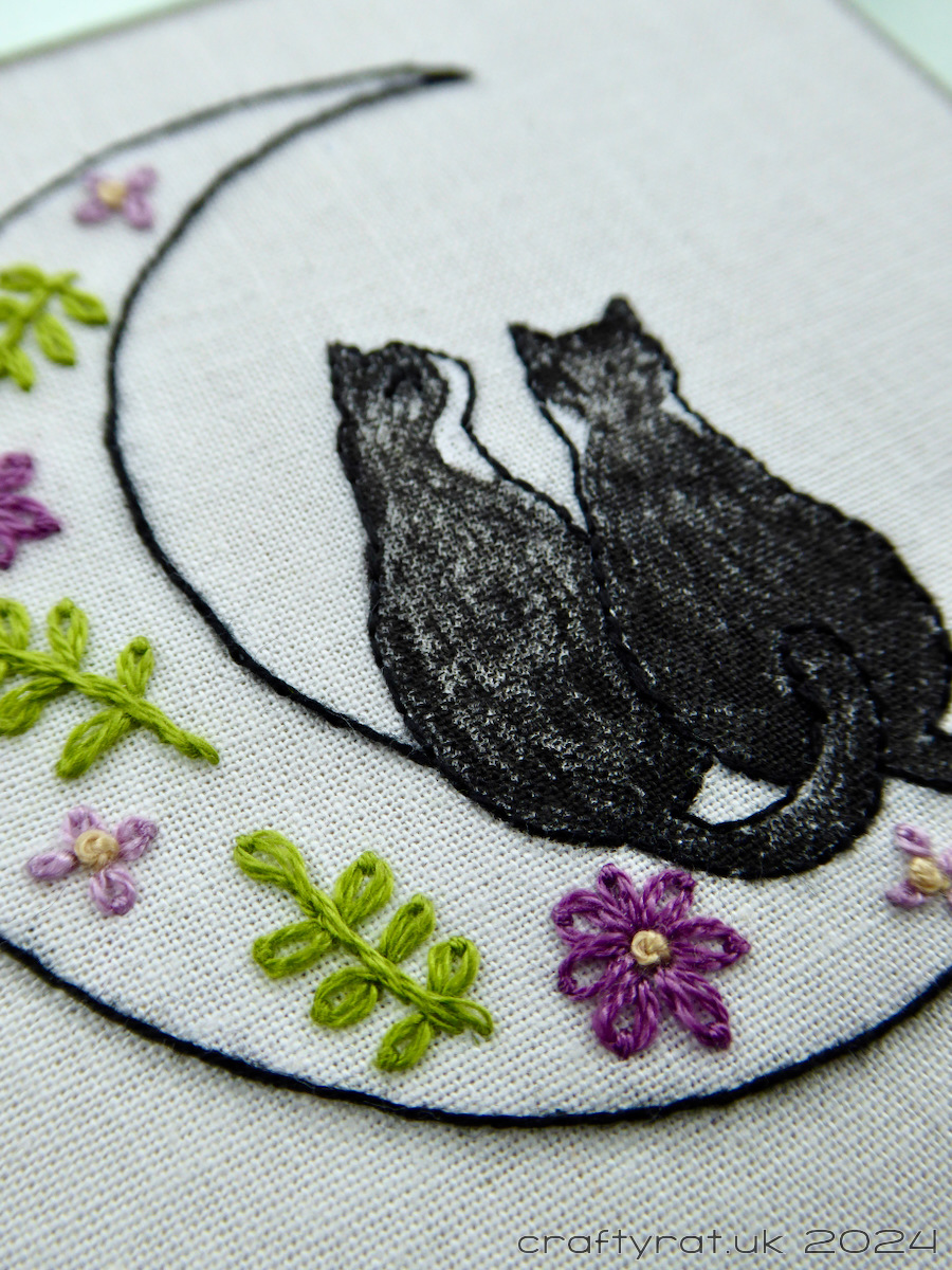 I decided to just paint the cats on this one. I could have added paint to the flowers and leaves like I did on the owl card, but I felt it would be easier to embroider the flowers rather than try to backstitch around individual petals. I’m getting more confident with adding paint to the fabric; I managed to get a reasonable variation in the depth of colour of the black so the cats have some shape and texture to them. And I still managed to avoid the paint bleeding into the fabric.