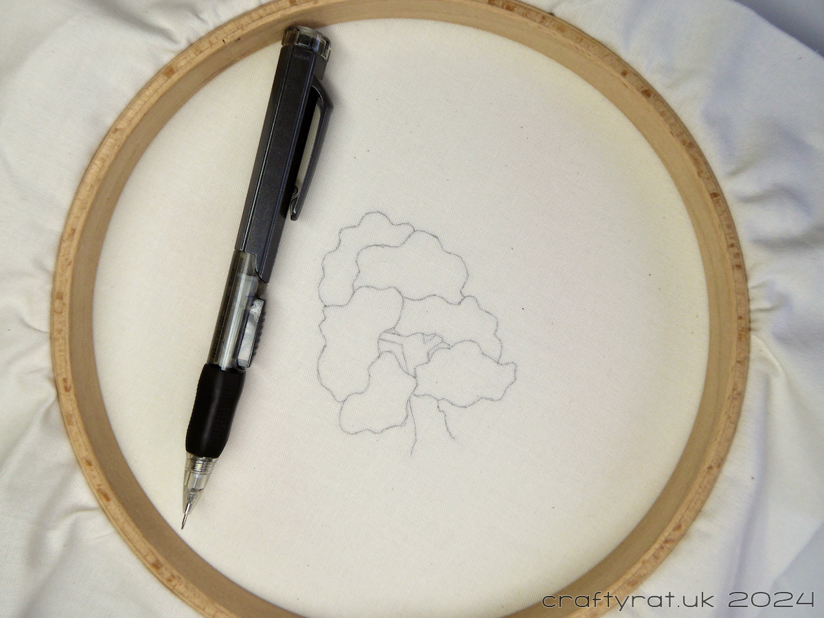 I put the cotton in a hoop and use a light pad and a pencil. There are lots of ways of transferring designs, but this works for me for embroidering simple designs on light-coloured fabric.