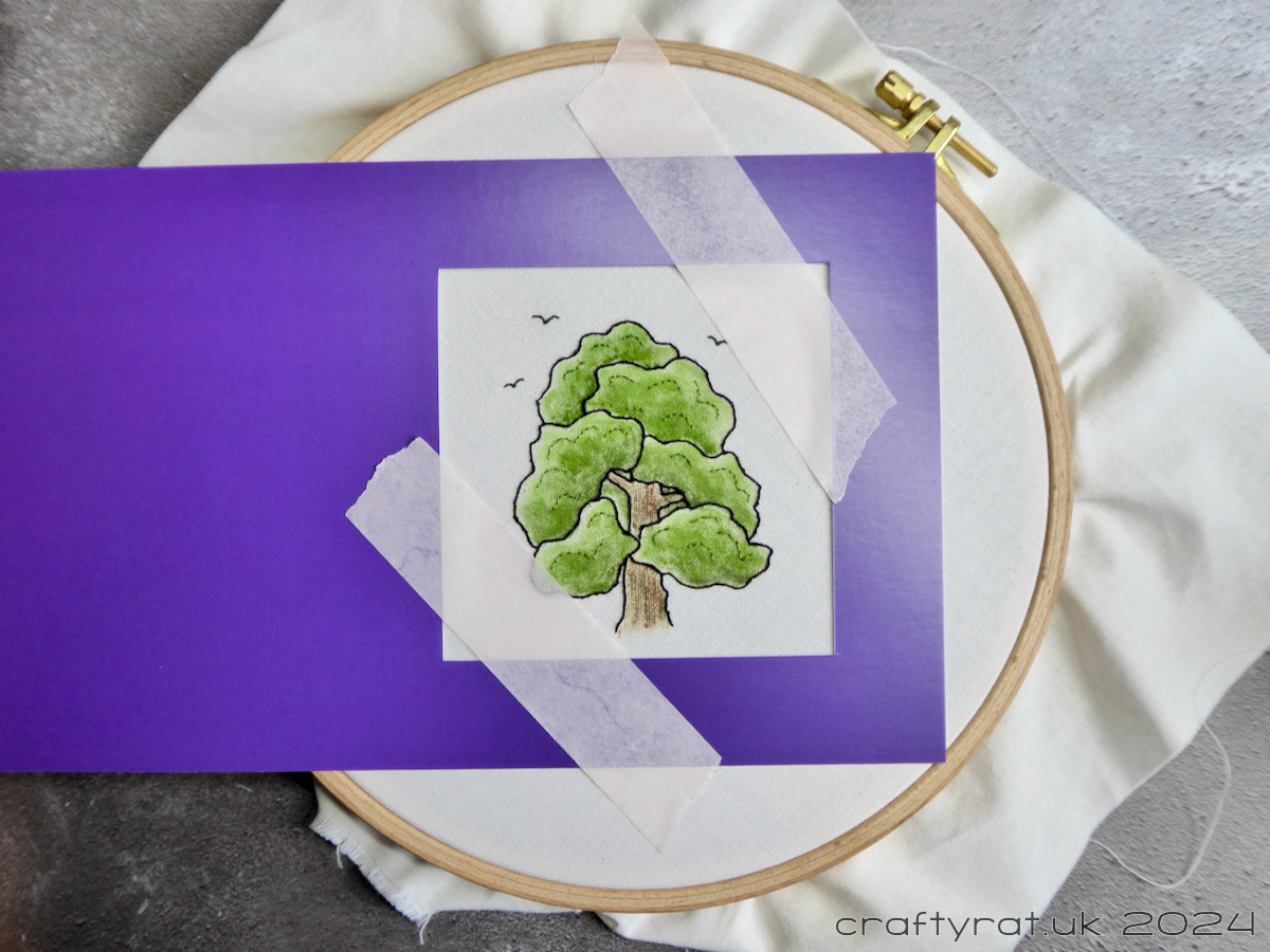 Lay the embroidery (still in the hoop) face up and position the card base with the aperture where you want it over the design. Hold it in place with a bit of masking tape.