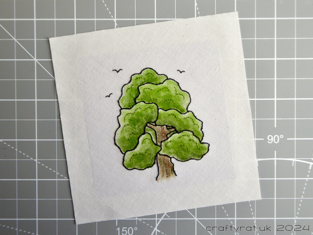 The side that you cover is the side that will show through behind the embroidery. I use single-sided card for my card bases, so one side is white and the other is coloured. Either side can be used, depending on the design and what effect you want, you could even add a design onto the cutout for a hint of a background through the cotton (always assuming you’re embroidering on a white or ivory cotton or similar).