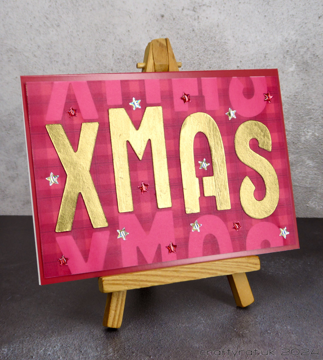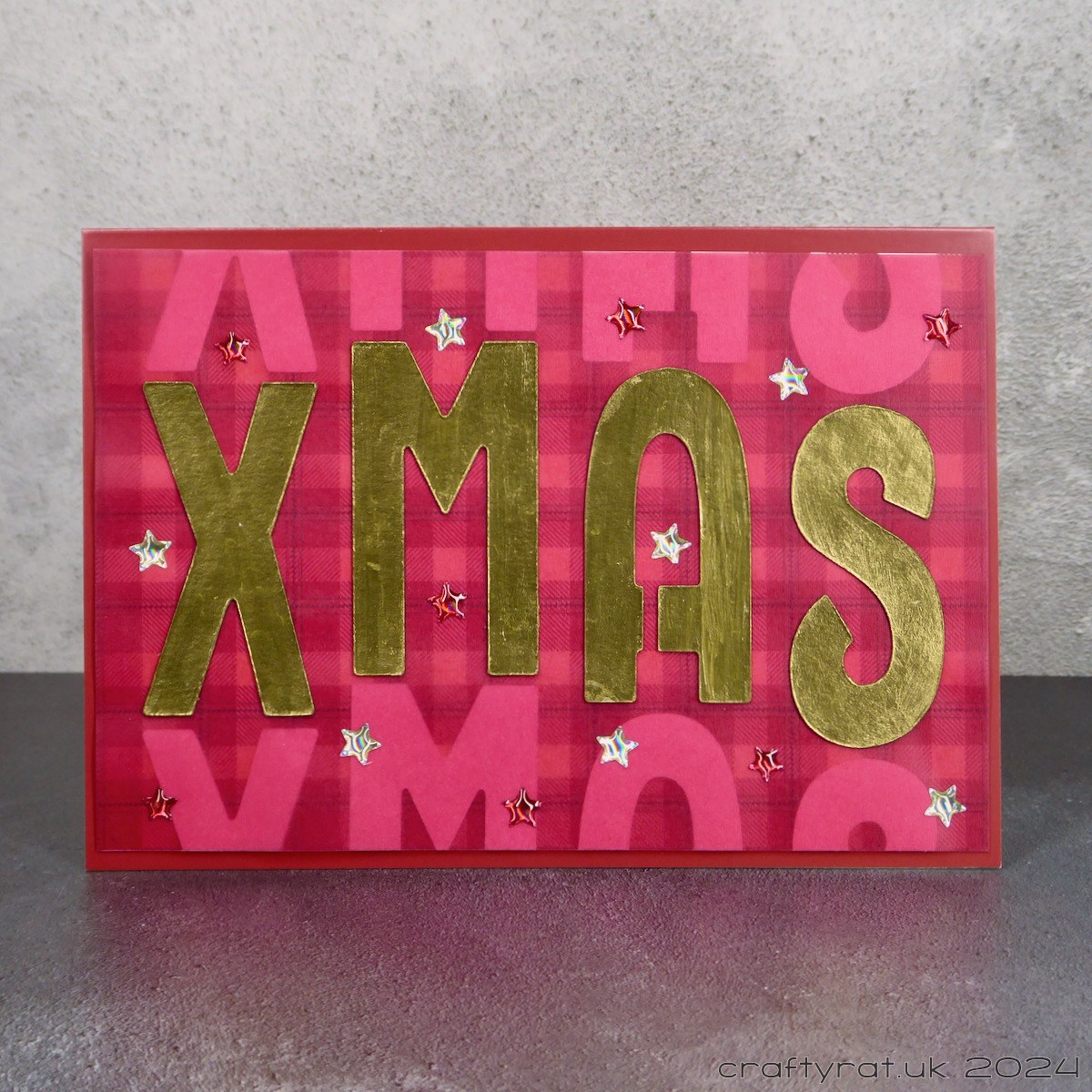 The first card I made this year is based on the leftovers from one of last year’s cards. I made a cutout XMAS card which, of course, left me with the letters that had been cut out. I used a paint pen to colour some of the letters gold and left another set white. Along with a sheet of patterned paper and some red vellum that was enough to create a card. Oh, and a few stick-on stars.