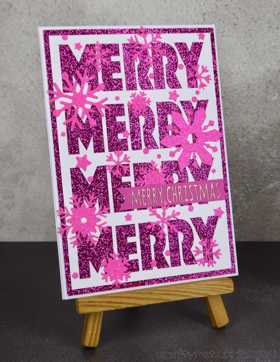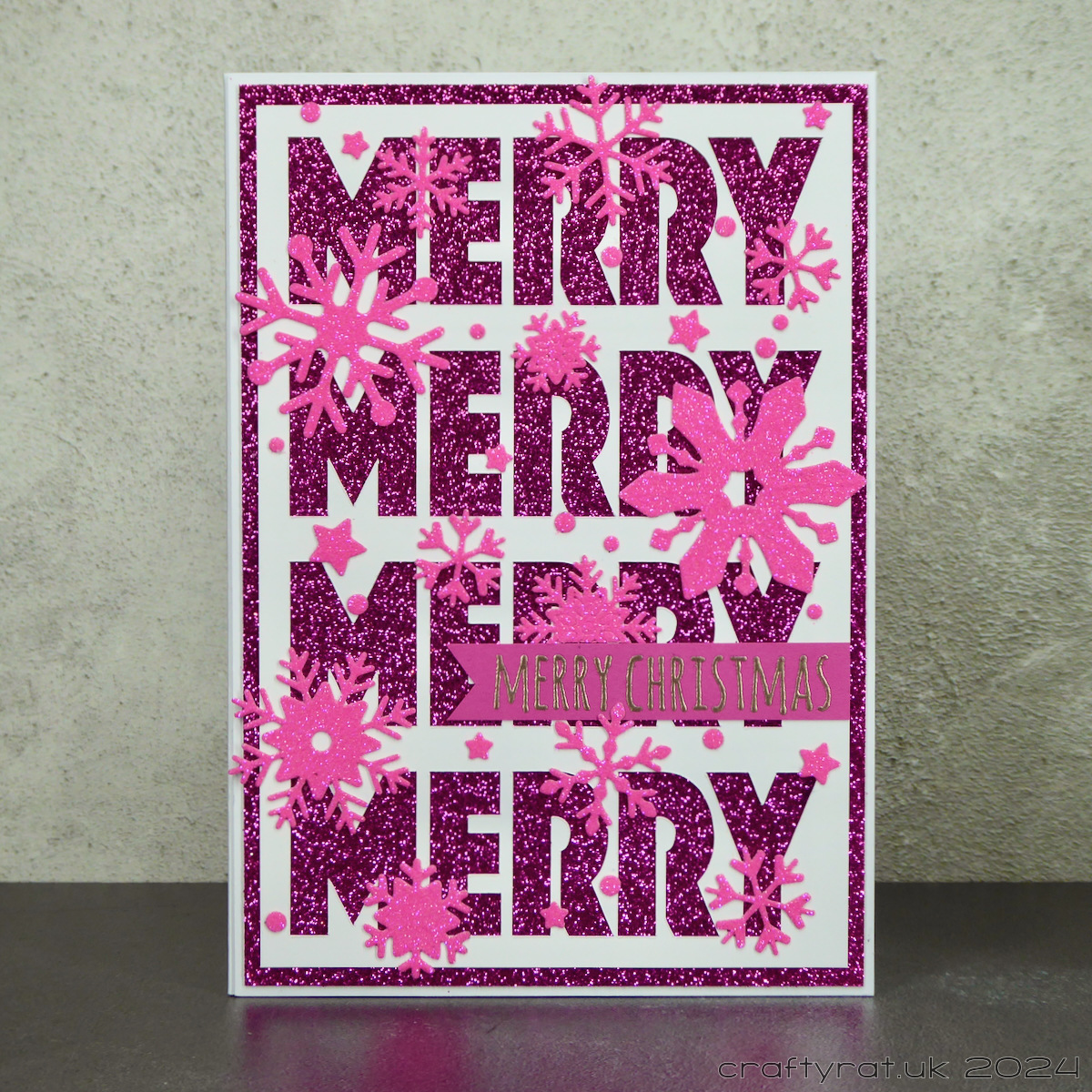When I made the landscape double merry cutout with my Cricut Maker, I also made this portrait version with four merries. I cut it out of plain white card to offset some of the pink glitter card that I was planning to use — it’s good to have a little contrast.