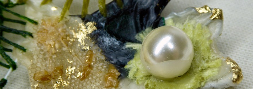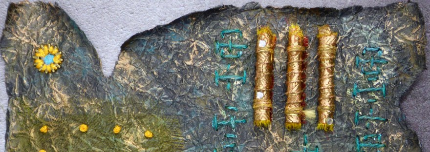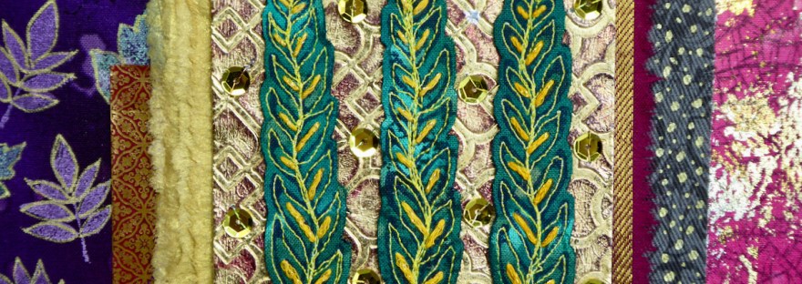 I took one preserved plane leaf and added stitch, couching, and lots and lots of bullion knots and ended up with this response to a prompt to use materials foraged from nature.