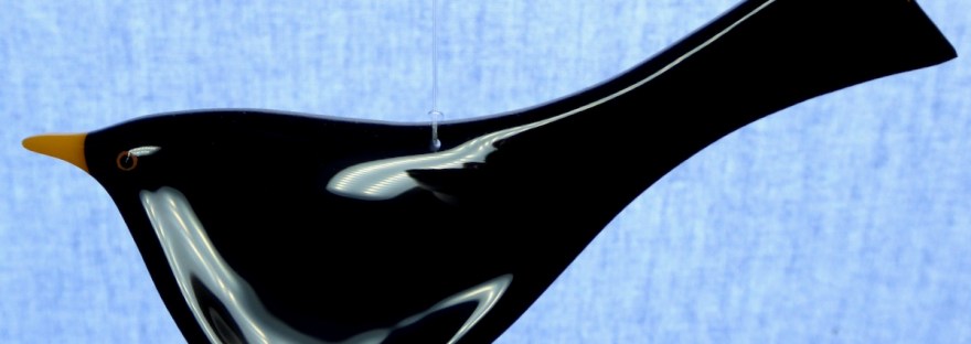 Title: blackbirdMedium: glassCreator: Robyn Coetzee The third bird in my little glass flock. An extremely black and shiny blackbird — I love how the reflected light bends over the curves. He now hangs in my window alongside the mis-tit and the rainbow bird. Creator: Robyn CoetzeeWebsite: http://www.robyncoetzee.co.ukOnline shop: http://www.robyncoetzee.co.uk/shopInstagram: instagram.com/robyncoetzeeglass/Facebook: http://www.facebook.com/RobynCoetzeeArtist/
