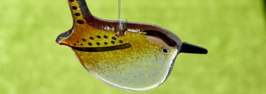 Title: Jenny wrenMedium: glassCreator: Robyn Coetzee The last, or rather, the latest fused glass bird in my little collection — I'm sure Robyn will come up with another design I can't resist. This little wren with its gold details looks super cute hanging in my window. Creator: Robyn CoetzeeWebsite: http://www.robyncoetzee.co.ukOnline shop: http://www.robyncoetzee.co.uk/shopInstagram: instagram.com/robyncoetzeeglass/Facebook: http://www.facebook.com/RobynCoetzeeArtist/