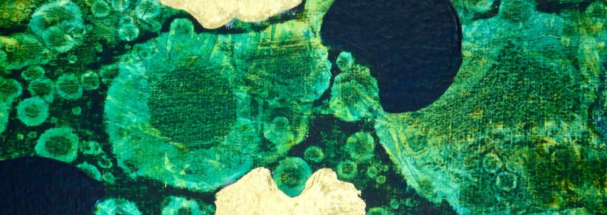 I was tidying up a bit and found three strips of paper left over from another project (from cutting the paper into squares for the Woodland abstracts). Rather than put them away and continue tidying, I turned them into this abstract triptych with acrylic paint, alcohol and gilding flakes. The tidying still isn’t finished… Apologies… Continue reading Green & gold abstracts