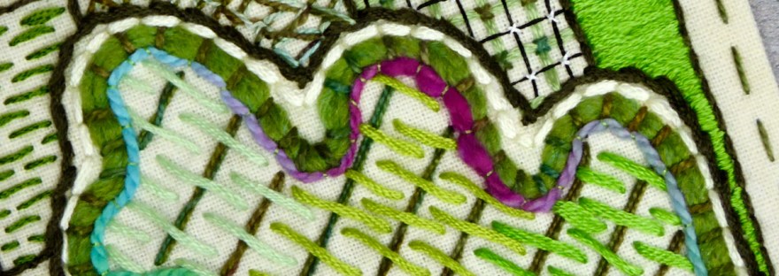 I took one preserved plane leaf and added stitch, couching, and lots and lots of bullion knots and ended up with this response to a prompt to use materials foraged from nature.
