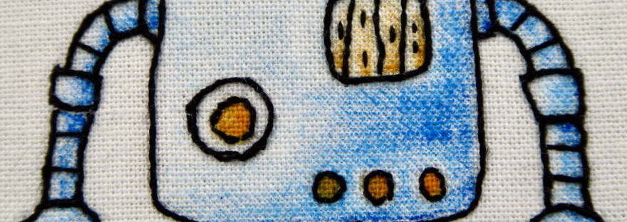 Another paint and stitch card; this time it's a happy robot who had a difficult journey to reach his destination.